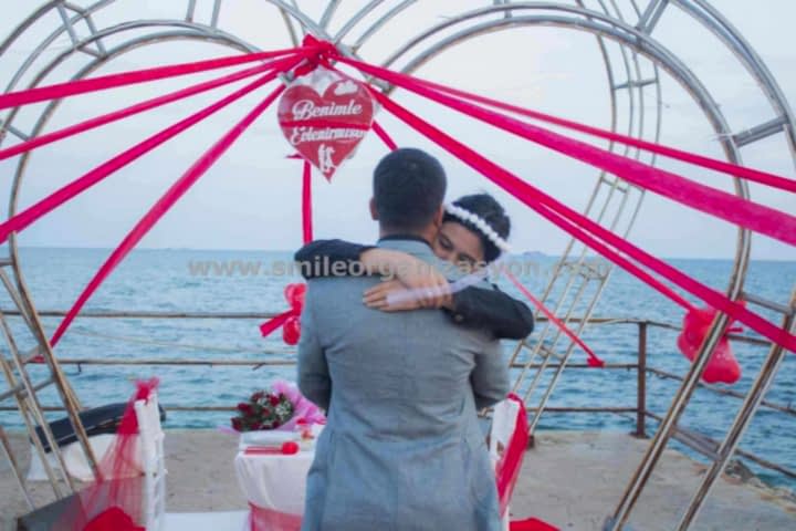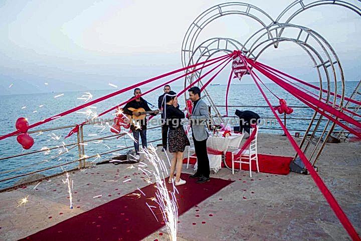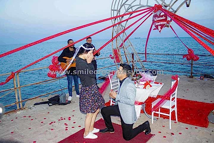 Sizinle bir saat belirliyoruz. Örnek: 6-7 , 7-8 , 8-9 vb. Ardından kız arkadaşınızla yemek yemek yada bir şeyler içmek bahanesi ile mersin muğdat sahilinde sürekli yaptığımız iskeleye doğru kız arkadaşınızı getiriyorsunuzz.İskeleye geldiğiniz an organizasyon başlıyor. Volkanlar yanmaya başlıyor meşaleler yanıyor. Canlı müzik devreye giriyor. Video kaydı alınıyor ve profesyonel fotoğraf çekimi eşliğinde teklifinizi gerçekleştiriyorsunuz.
