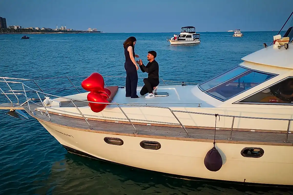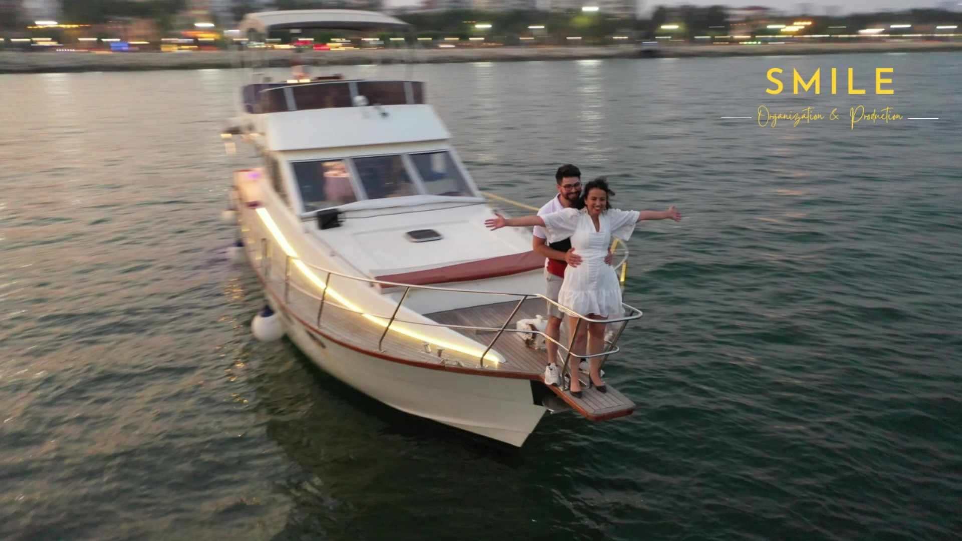 Sizinde yardımınızla kız arkadaşınızla birlikte yata doğru gidiyoruz. Tam yatın önüne geldiğimiz an Volkanlar yanmaya başlıyor, meşaleler yanıyor. Canlı müzik devreye giriyor. Video kaydı alınıyor ve profesyonel fotoğraf çekimi eşliğinde yata girip teklifinizi gerçekleştiriyorsunuz. Daha sonra yatımız 1 saatlik tur için açılıyor. O esnada pasta içecek ve ikramlardan servis ediyoruz. Müzik yapmaya ve fotoğraf çekmeye devam ediyoruz. Sizler ise anın tadını çıkarıyorsunuz ve istediğiniz ekstra hizmeti alabilirsiniz.